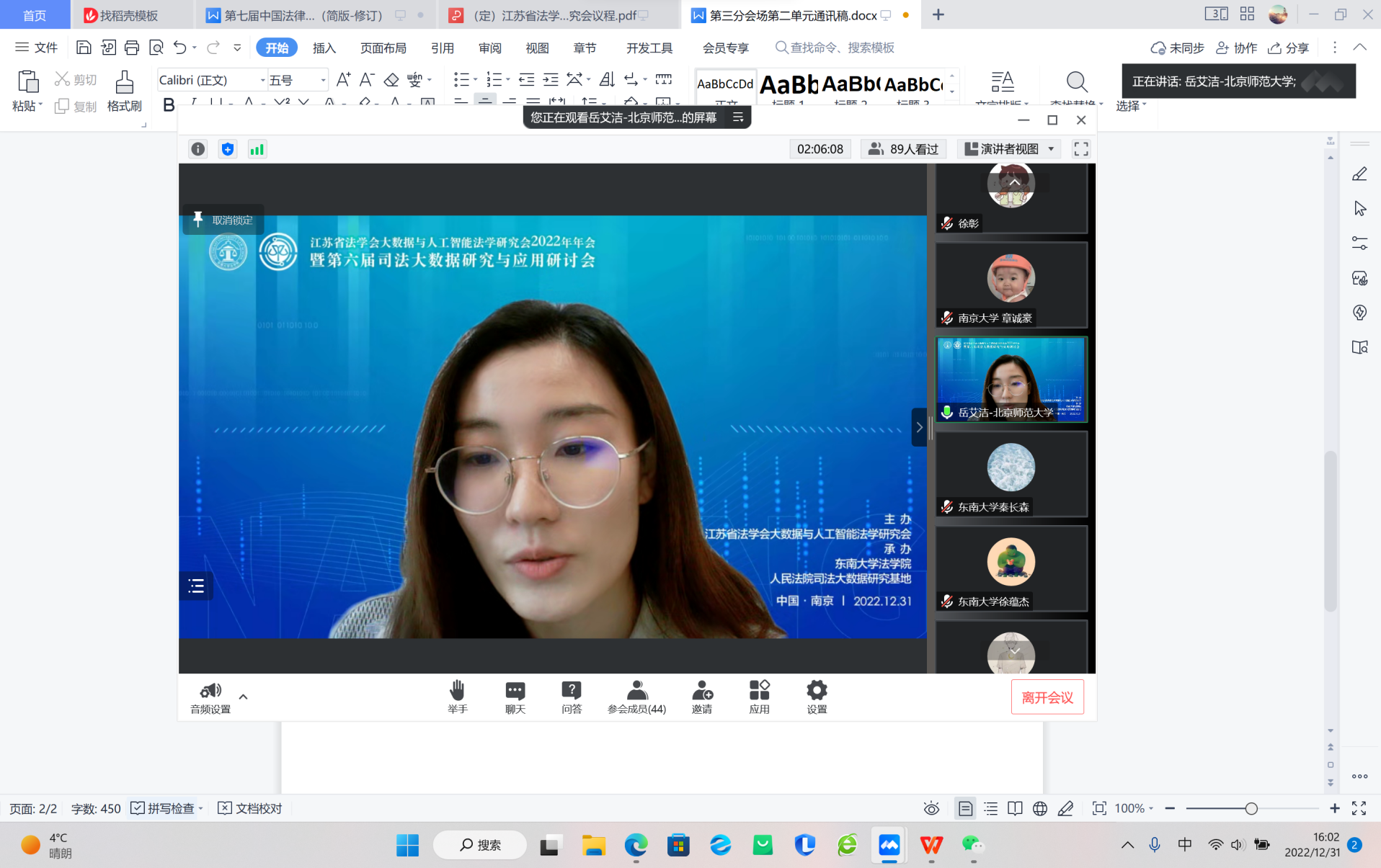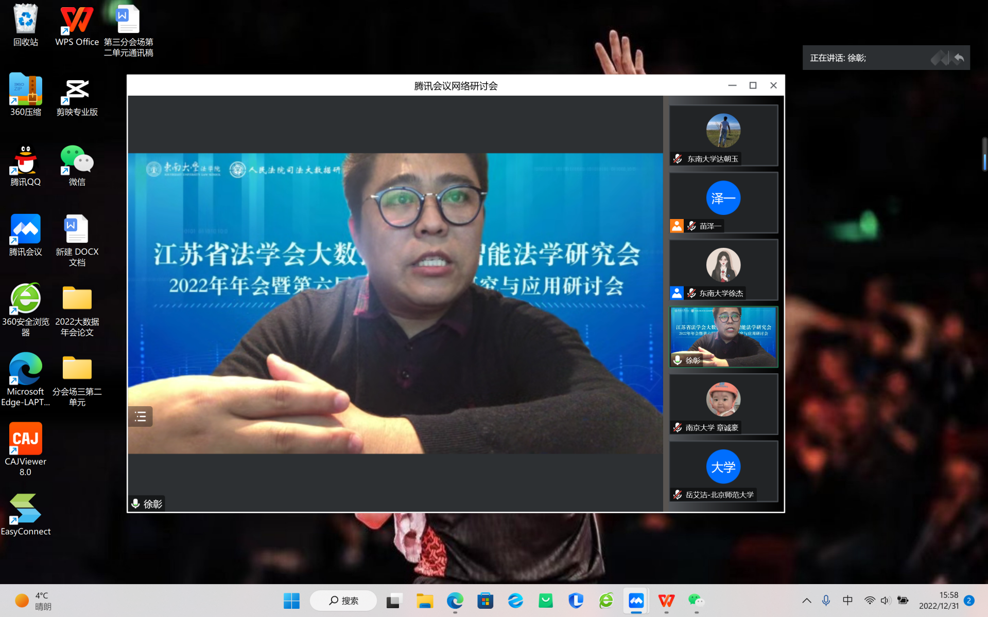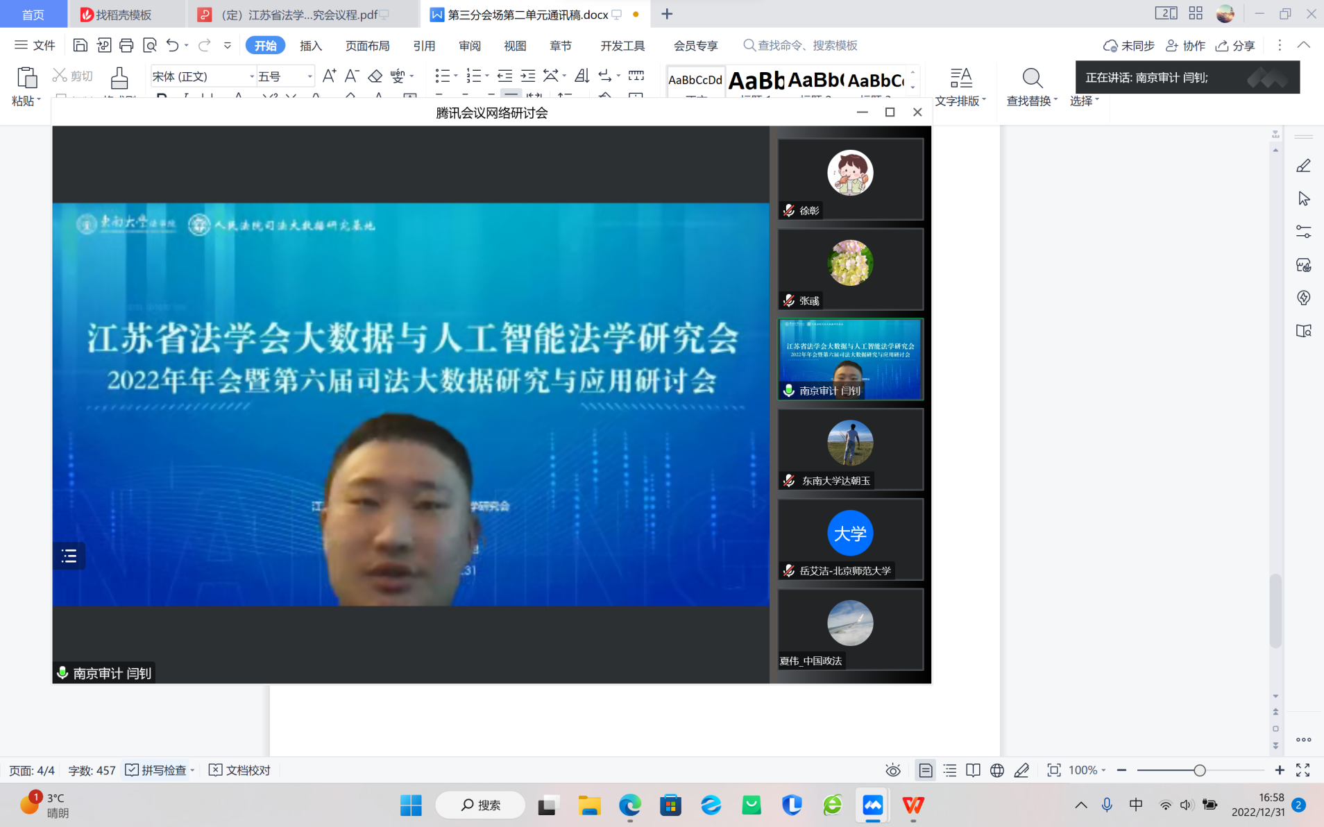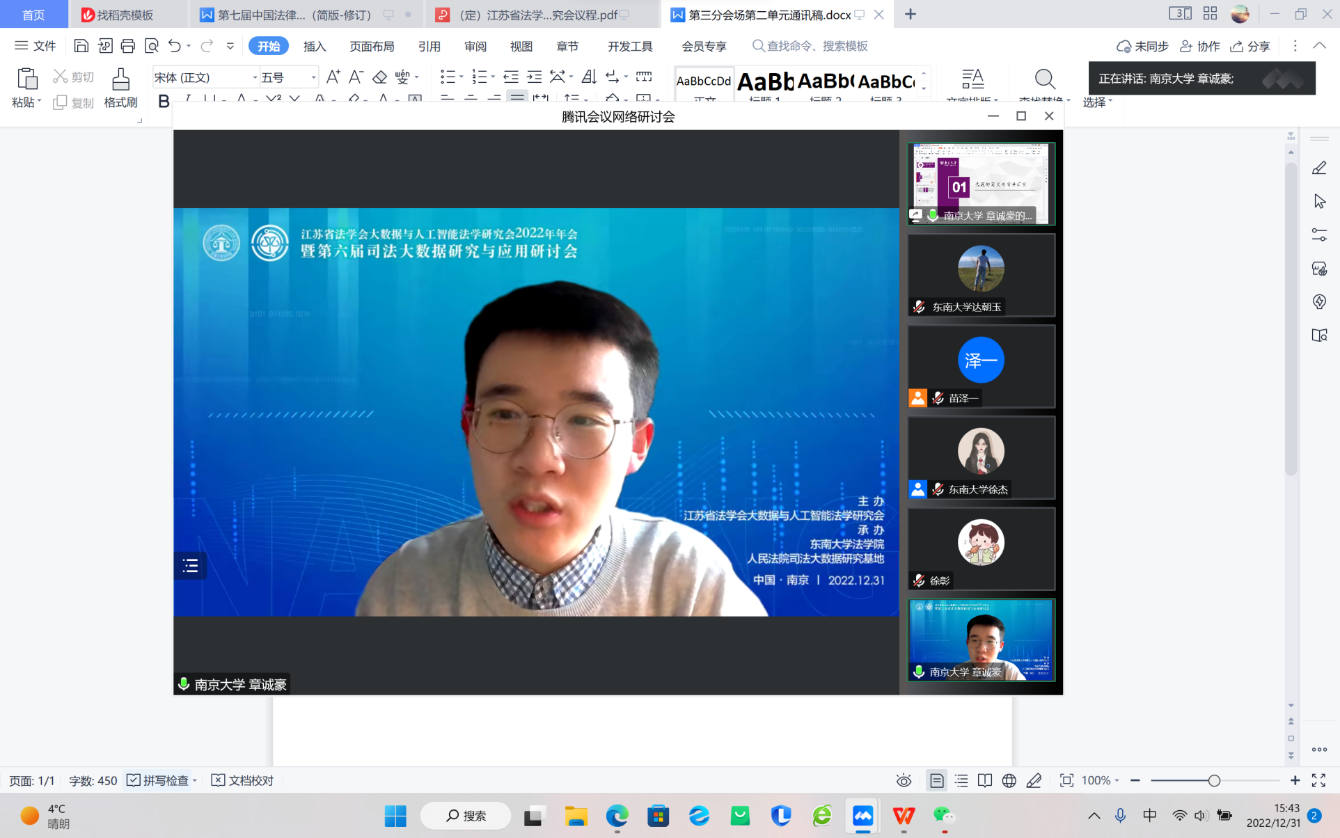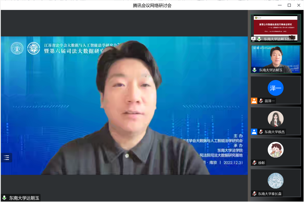 2022年12月31日,由江苏省法学会大数据与人工智能法学研究会主办,366net必赢官网、人民法院司法大数据研究基地承办的“江苏省法学会大数据与人工智能法学研究会2022年年会暨第六届司法大数据研究与应用研讨会”在南京以线上方式召开。来自江苏省高级人民法院、江苏省人民检察院、江苏省司法厅以及南京、无锡、苏州、常州、徐州、南通等各地市实务部门的领导、专家,南京大学、366net必赢官网、南京师范大学、苏州大学等高校学者200余人参与会议。
