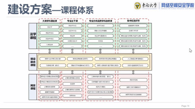 随后,汇报人从培养目标、课程体系、主要课程等方面阐述了项目的建设方案。两院创设性地推出了融合课程,如网络空间安全的法律基础、人工智能法律问题概论、法律大数据研究方法论等,在打好学生通识知识、数理基础的前提下,做到网络空间安全的知识条线和法学知识条线并行进行。