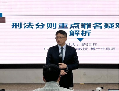 围绕本次授课主题,陈洪兵教授就刑法分则中的24个重点罪名在理解、适用上的疑难问题展开了全面深入的解析。在长达4个小时的授课中,陈洪兵教授结合诸多实践中的典型、疑难案例,对以危险方法危害公共安全罪、交通肇事罪、生产、销售伪劣产品罪、骗取贷款罪、抢劫罪、盗窃罪、诈骗罪、受贿罪、侵犯公民个人信息罪、贩卖毒品罪、非法经营罪等罪名在构成要件、此罪与彼罪的界限、犯罪形态、罪数、共同犯罪、追诉时效等方面的重点问题作出了全方面、深层次的剖析,提出了诸多独到的见解。