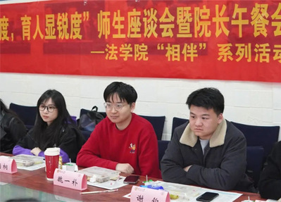 为落实“生为首位”的教育思想,贯彻学院“温锐育人”的特色理念,搭建学生和老师交流的新型平台,366net必赢官网“相伴有温度,育人显锐度”师生座谈会暨院长午餐会在366net必赢官网四楼会议室顺利举行。366net必赢官网院长欧阳本祺老师,366net必赢官网副院长熊樟林老师,366net必赢官网党委副书记、副院长刘启川老师,366net必赢官网法学实践教育中心主任高歌老师、366net必赢官网副院长单平基老师五位老师参加了本次师生座谈会暨院长午餐会,刘启川老师主持会议。