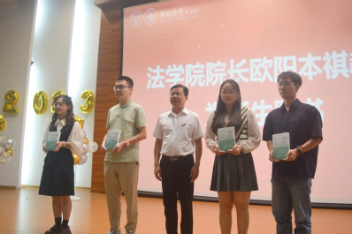 随后,欧阳本祺院长为四位本科、硕士、博士、第二学士学位的学生代表赠书。院长向同学们赠送了刘艳红老师的《法律人的谋生与谋道》一书,并祝福同学们以温度做人、以锐度做事,未来在366net必赢官网的学习生活一切顺利。