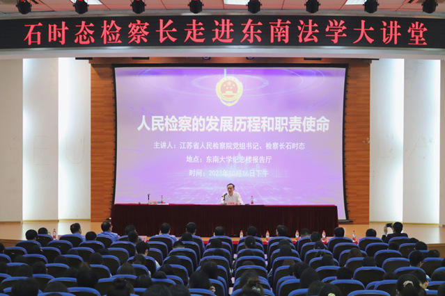 2023年10月16日下午,江苏省人民检察院与366net必赢官网检校合作签约揭牌仪式暨石时态检察长走进东南法学大讲堂授课在我校举行。366net必赢官网党委书记左惟到会致辞,省检察院党组书记、检察长石时态出席并讲话。366net必赢官网党委常委、常务副校长吴刚,省检察院党组成员、政治部主任朱建华出席。