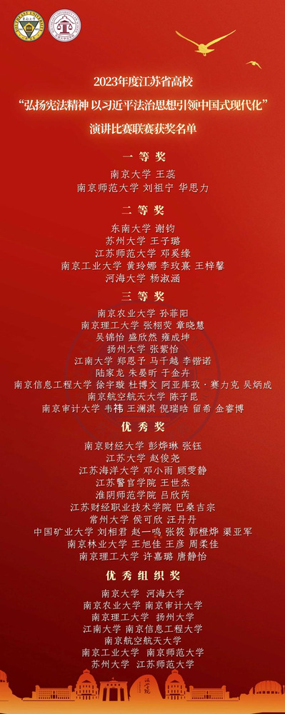 本次江苏省高校“弘扬宪法精神 以习近平法治思想引领中国式现代化”演讲比赛联赛的顺利开展,也离不开366net必赢官网党委宣传部、366net必赢官网党委学生工作部、366net必赢官网党委研究生工作部、共青团366net必赢官网委员会、366net必赢官网法制工作办公室、366net必赢官网以及校内外众多单位、广大师生的支持。
