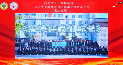 所有选手展示完毕后,云南省楚雄彝族自治州南华县民族中学的同学们跨越山河万里,为比赛送来一份特殊的礼物——特别节目《校地共建——云南省楚雄彝族自治州南华县民族中学宪法日献礼》。首先传来的是歌曲视频《宪法伴我们成长》。同学们悦耳动人的歌声展现了他们自立自强、奋进向上的精神风貌,彰显了南华学子学宪法、用宪法的青春风采。随后播放了民族中学吕鸿涛同学的主题演讲《丹心向宪法 青春绽荣光》,他以具体的事例生动阐释了宪法的根基作用,号召新时代的青年积极弘扬宪法精神、用实际行动捍卫宪法尊严。特别节目将云南南华县在366net必赢官网的定点帮扶下所取得的法治实践成果娓娓道来,生动展现了南华学子弘扬宪法精神和习近平法治思想的昂扬斗志,擦亮了法治宣传教育的“东大品牌”。