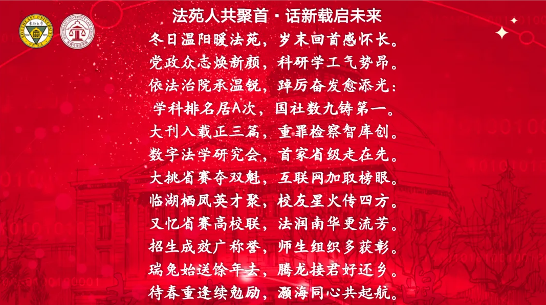 孟鸿志老师为学院本年度取得的显著成果感到由衷的喜悦,并向与会的各位老师和校友致以热烈的新年祝贺。他表示将继续积极开展科研工作、推进课题研究,为推动学院的进一步高质量发展贡献力量。