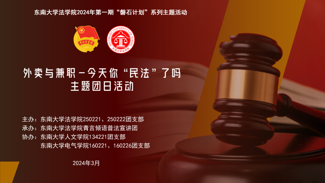 本次主题团日活动以大学生身边常见的外卖问题和兼职问题展开,通过分析案例,带大家走进民法的世界,了解法律对于消费者权益的保障,学习运用法律知识合理维权,提高同学们法律意识。