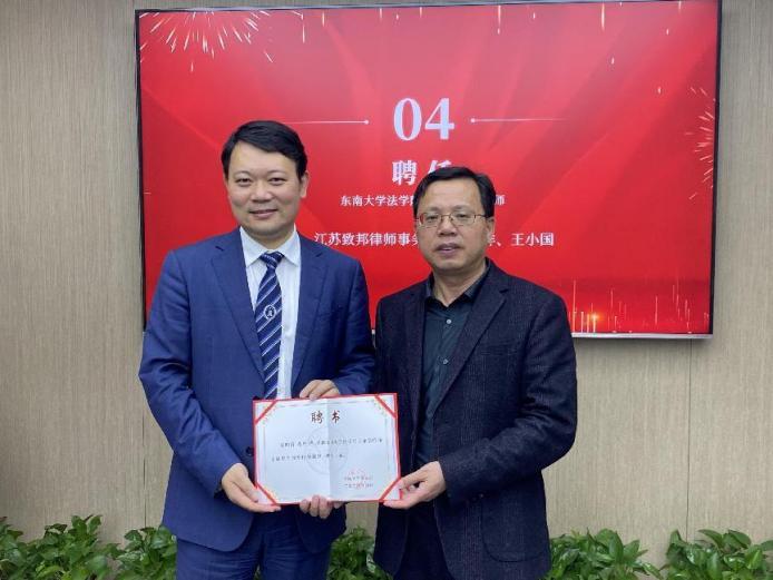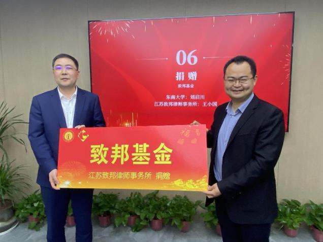 刘启川书记和王小国主任共同进行“致邦基金”捐赠牌的递交仪式。此次,江苏致邦律师事务所再次向必赢捐赠10万元,用于启动东大法科新大楼建设。
