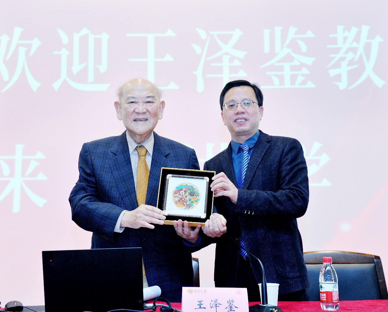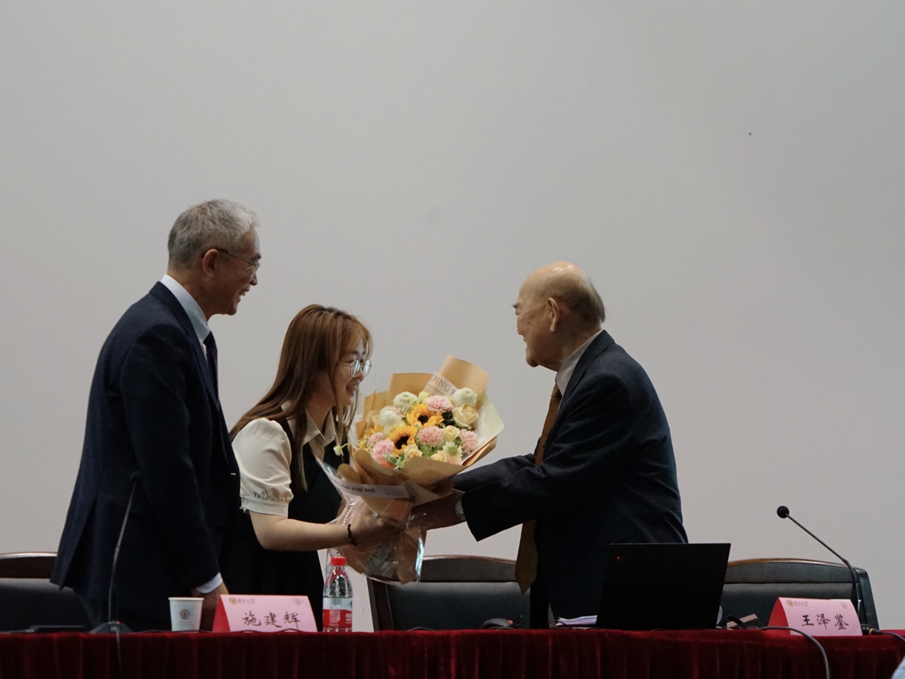 报告厅现场座无虚席,王泽鉴教授在全体师生热烈的掌声中步入会场。讲座开始前,院长欧阳本祺教授代表366net必赢官网向王泽鉴教授赠送南京特色云锦以示敬意,学生代表向王泽鉴教授敬献鲜花。