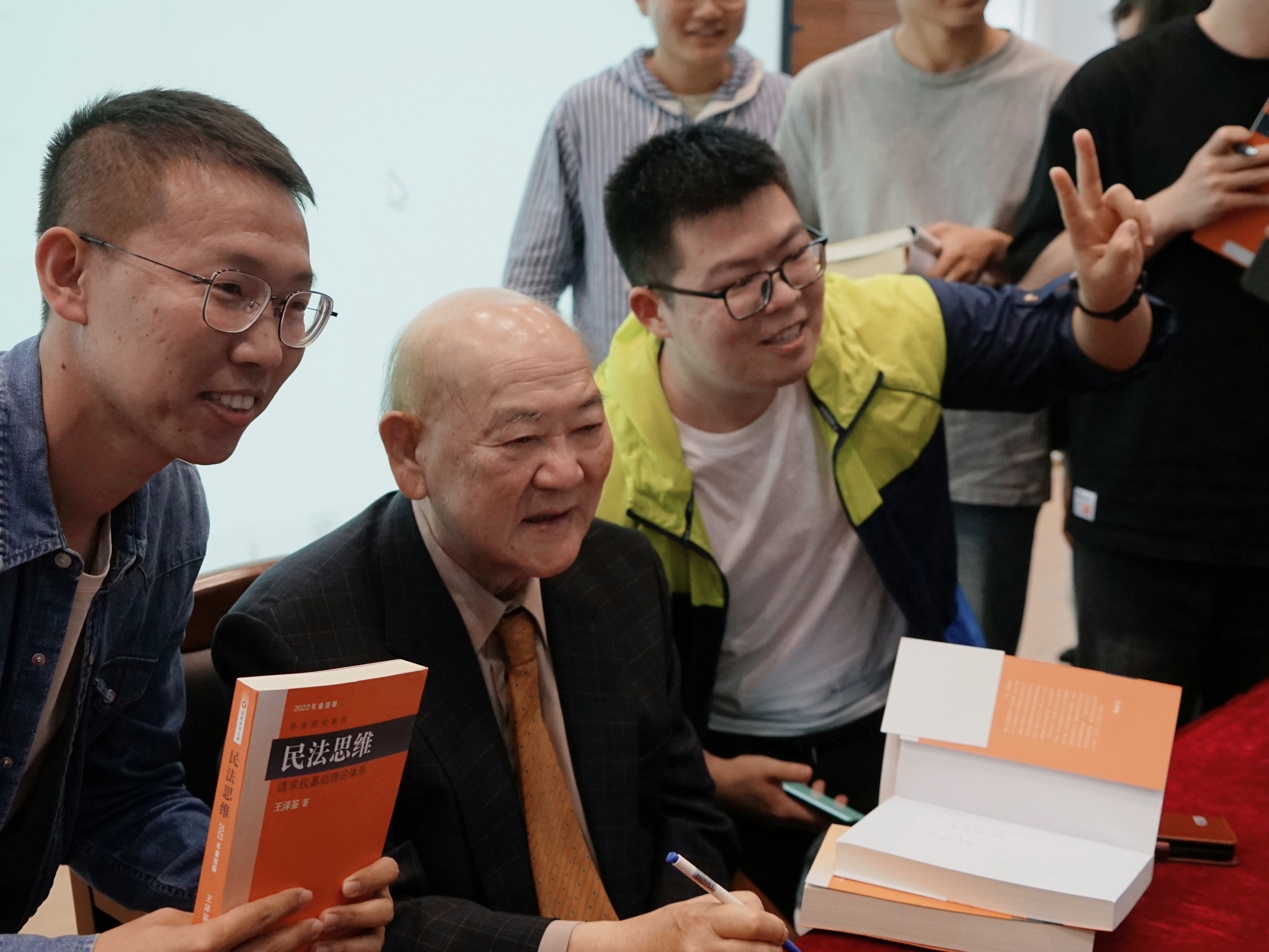 讲座的最后,王泽鉴教授在同学们的热情簇拥下签名并鼓励广大学子认真学习民法,为法治的完善作贡献。