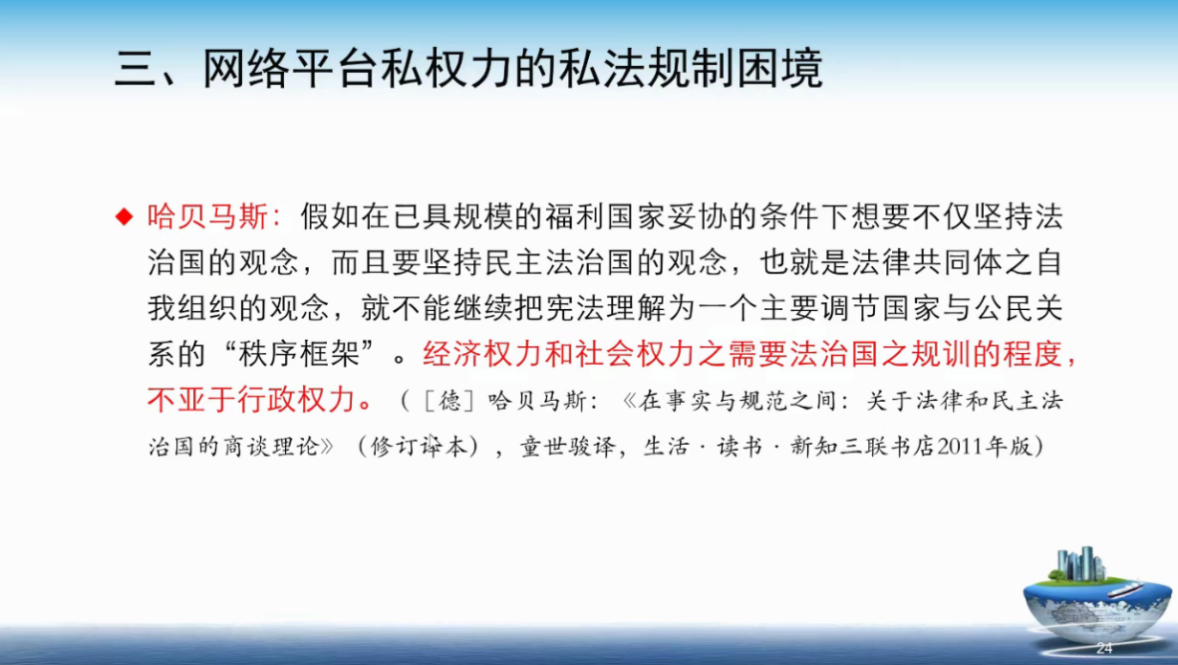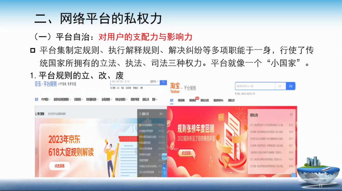 接着,刘权教授介绍了网络平台的私权力。在数字经济时代,网络平台承担着维护网络市场秩序、保障用户权益的公共职能。网络平台对其用户,特别是对平台内经营者,具有强大的支配力和影响力,主要包括:第一,立、改、废平台规则,行使“准立法权”。第二,实施具体的管控措施,行使“准行政权”。第三,在线解决纠纷,行使“准司法权”。平台权力属于典型的私权力,既不能将平台权力简单视为传统意义上的私权利,也不应将平台的治理行为视为传统意义上的商事行为。