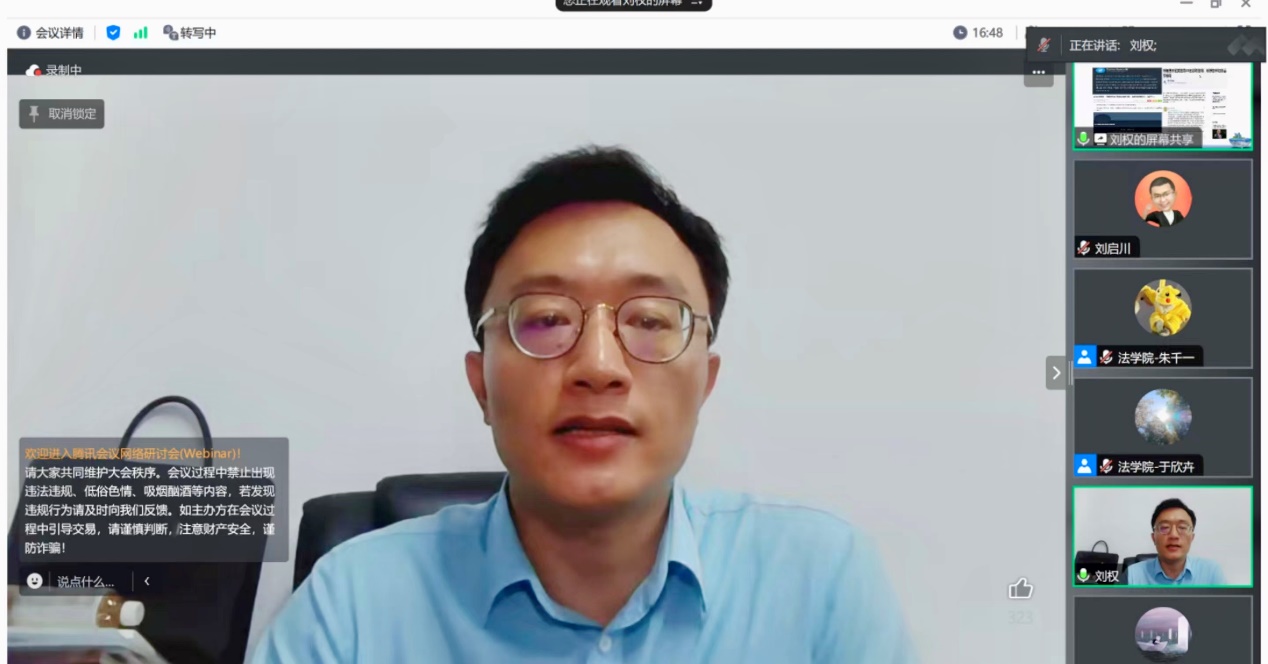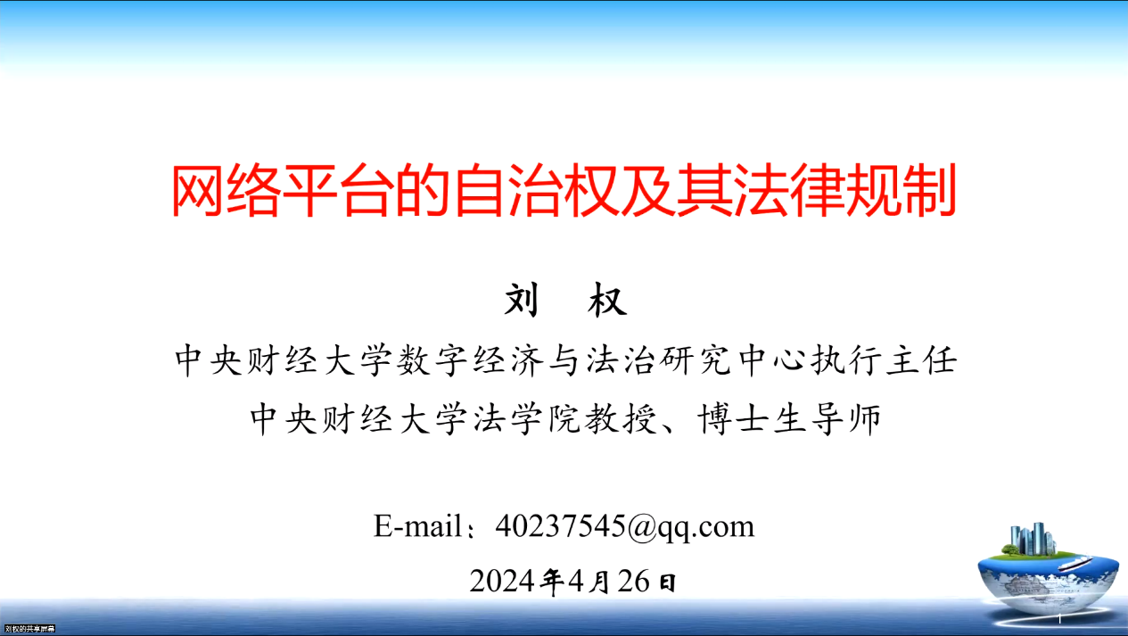 2024年4月26日晚19点,366net必赢官网科技节系列活动之“数智时代·科技与法治专题讲座”暨研究生人文与科学素养系列讲座通过线上腾讯会议的方式举行。中央财经大学“龙马学者”特聘教授、博士生导师、366net必赢官网副院长刘权老师应邀以“网络平台的自治权及其法律规制”为题在366net必赢官网开展讲座。本次研究生人文与科学素养系列讲座活动由366net必赢官网研究生会承办,全校600余名同学参与到本次讲座直播中。366net必赢官网党委书记刘启川老师出席本次活动。