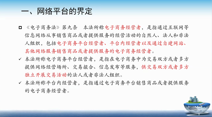网络平台在现代社会中扮演着越来越重要的角色,刘权教授首先为同学们厘清了网络平台的界定。我国法律将网络平台界定为一种信息网络系统。国家市场监督管理总局在2021年发布《互联网平台分类分级指南(征求意见稿)》,将电子商务平台分为六大类型(网络销售类平台、生活服务类平台、社交娱乐类平台、金融服务类平台和计算应用类平台)和三大级别(超级平台、大型平台和中小平台)。这些分类旨在更好地管理不同类型的网络平台,以满足用户和卖家的需求。