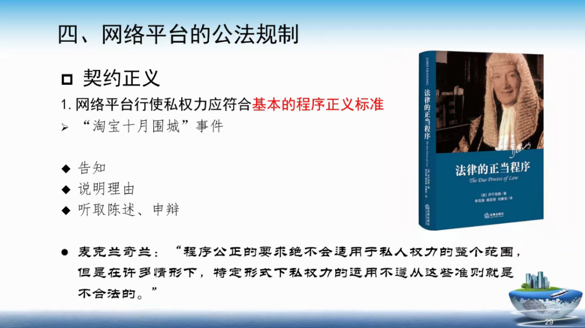 传统私法对网络平台的规范存在局限,因此,有必要引入公法原理及其价值要求,对平台私权力进行适度干预。刘权教授建议,网络平台制定和实施规则时,应遵循基本的程序正义和实体正义标准。法院应对平台滥用私权力的行为进行必要的司法审查。立法者应根据权责利相统一的原则,科学合理地设置平台的主体责任。
