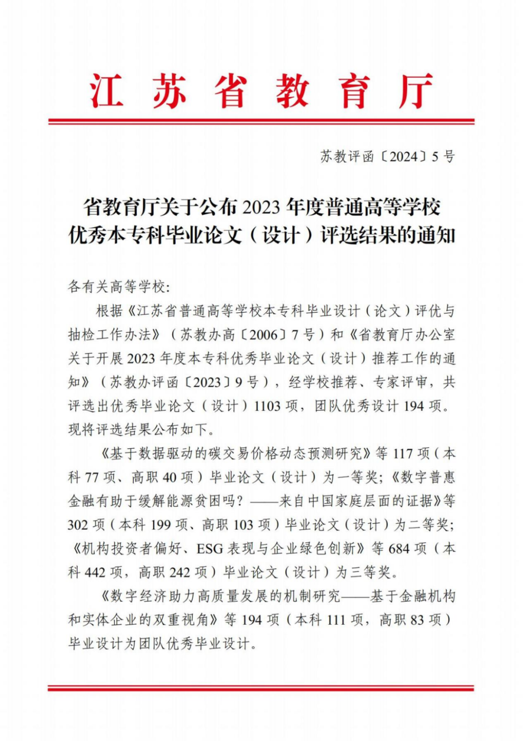 江苏省学位委员会、江苏省教育厅于2024年4月29日公布了2023年江苏省优秀本专科毕业论文(设计)评选结果,必赢2023届本科生周午凡荣获2023年江苏省优秀本科毕业论文,指导老师为刘启川教授。