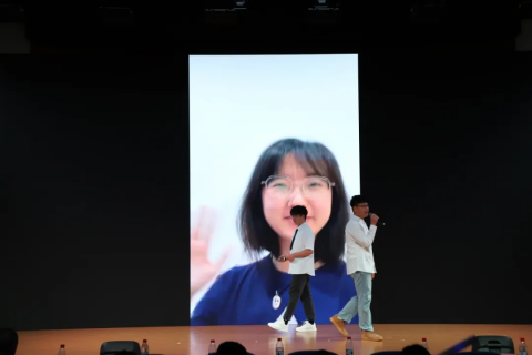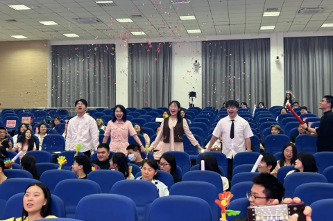 一曲完毕,张越老师和张运昊老师送出载满祝福的玩偶,向毕业生们表达了美好期盼。张越老师把方才演唱的《隐形的翅膀》中最喜欢的歌词送给大家,祝每个人心中都能长出一双隐形的翅膀,“带你飞,给你希望、飞过绝望”。张运昊老师则诵读了苏轼的名作《定风波》,希望同学们在跨越各种各样的坎、攀登更高山峰时,都能够保持这样一种自如舒适的心境,“竹杖芒鞋轻胜马,谁怕?一蓑烟雨任平生”。