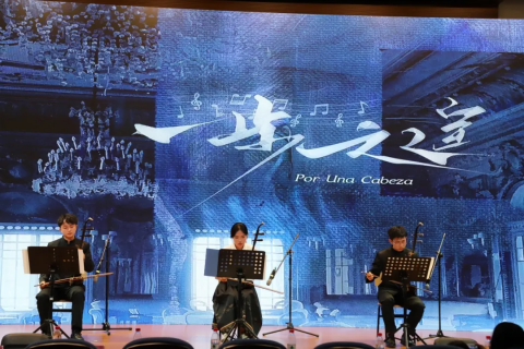 王萌、吴博优、郝子豪同学带来的二胡三重奏《一步之遥》,让探戈与二胡碰撞,民族乐器与西班牙名曲相互交融,呈现出了别样的精彩。
