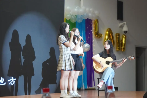 肖庆铃、刘宇星、陈天钰同学带来了弹唱歌曲《推开世界的门》。