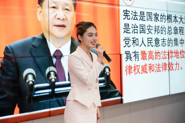 宪法是国家的根本大法,是治国安邦的总章程、党和人民意志的集中体现。全体人民都应该成为社会主义法治的忠实崇尚者、自觉遵守者和坚定捍卫者。王蕊同学用小切口反映大主题、用小故事讲好大道理,以极具创新性和感染力的演讲表达了“树立宪法意识、恪守宪法原则、弘扬宪法精神、履行宪法使命”的坚定信念,告诉我们宪法的根基在于人民发自内心的拥护,宪法的伟力在于人民出自真诚的信仰。展现出当代大学生弘扬宪法精神、坚持习近平法治思想的强烈使命感和责任感,赢得了在场观众的阵阵喝彩。
