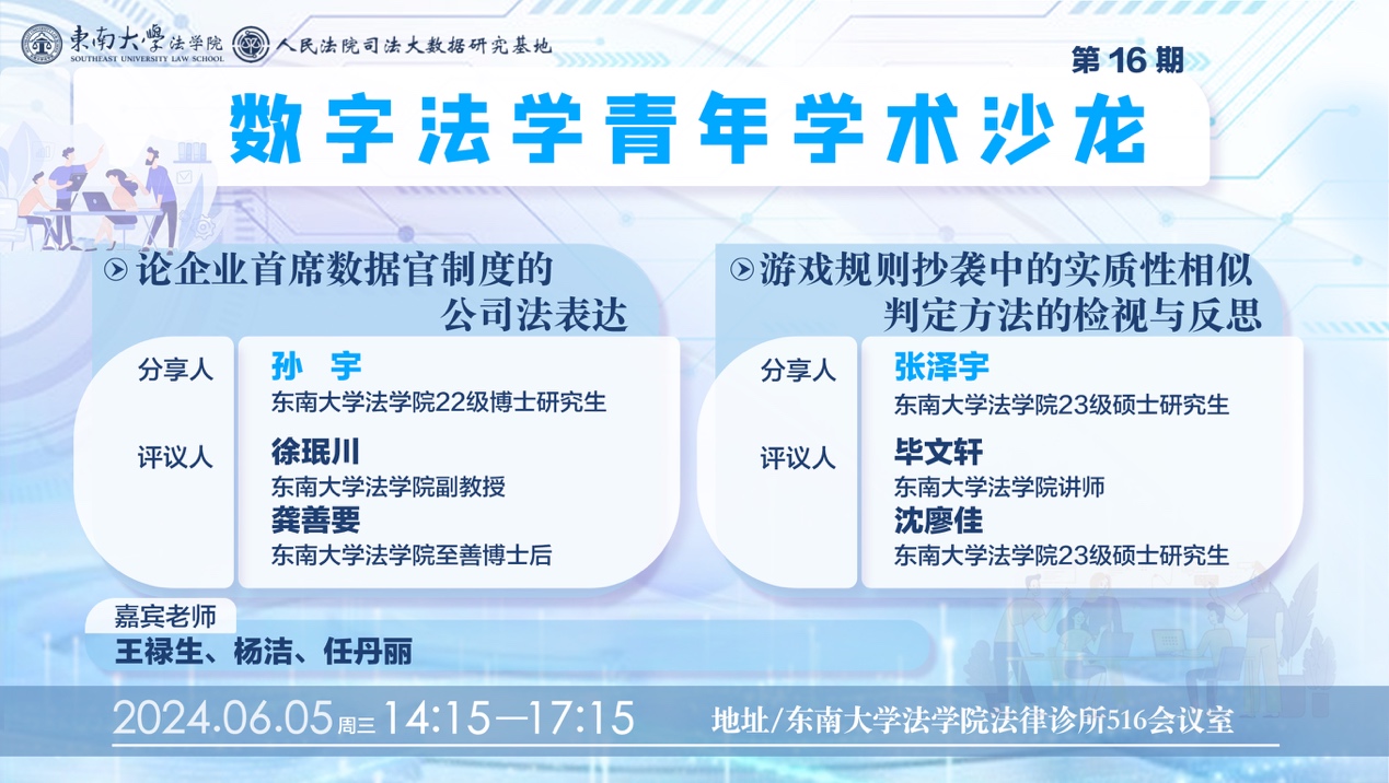 2024年6月5日下午,第16期数字法学青年学术沙龙在366net必赢官网法律诊所516会议室顺利举行。此次沙龙由徐珉川副教授主持,社科处处长王禄生教授、366net必赢官网杨洁副教授、任丹丽副教授、毕文轩老师、龚善要老师及司法大数据基地学生均参与此次学术沙龙活动。