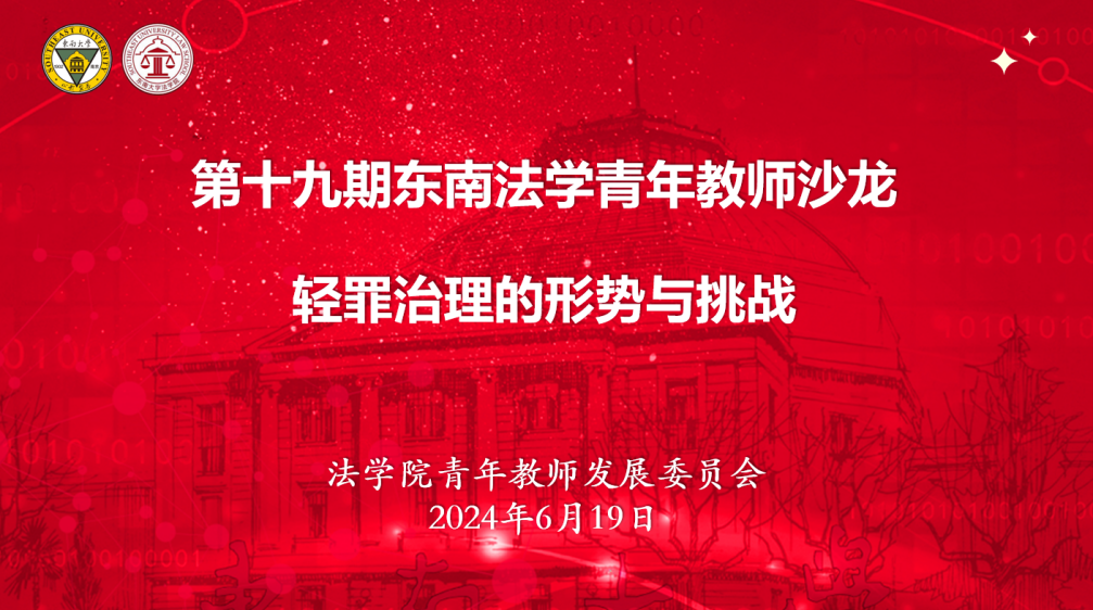 2024年6月19日下午,第十九期东南法学青年教师沙龙在366net必赢官网510会议室顺利举行,主题是“轻罪治理的形势与挑战——基于中德日比较法视野”。本期沙龙由366net必赢官网青年教师委员会和刑法教研室组织,青年教师发展委员会副主任李川教授担任主持人,刑法教研室梁云宝教授、刘建利副教授、贺颖昕讲师担任主报告人,钱小平副教授、杨志琼副教授、冀洋副教授、张运昊讲师、朱姗姗博士后、龚善要博士后担任与谈人,刑法学方向研究生共同参与,围绕当前刑法理论和实践热议的轻罪治理问题进行了深入讨论交流。