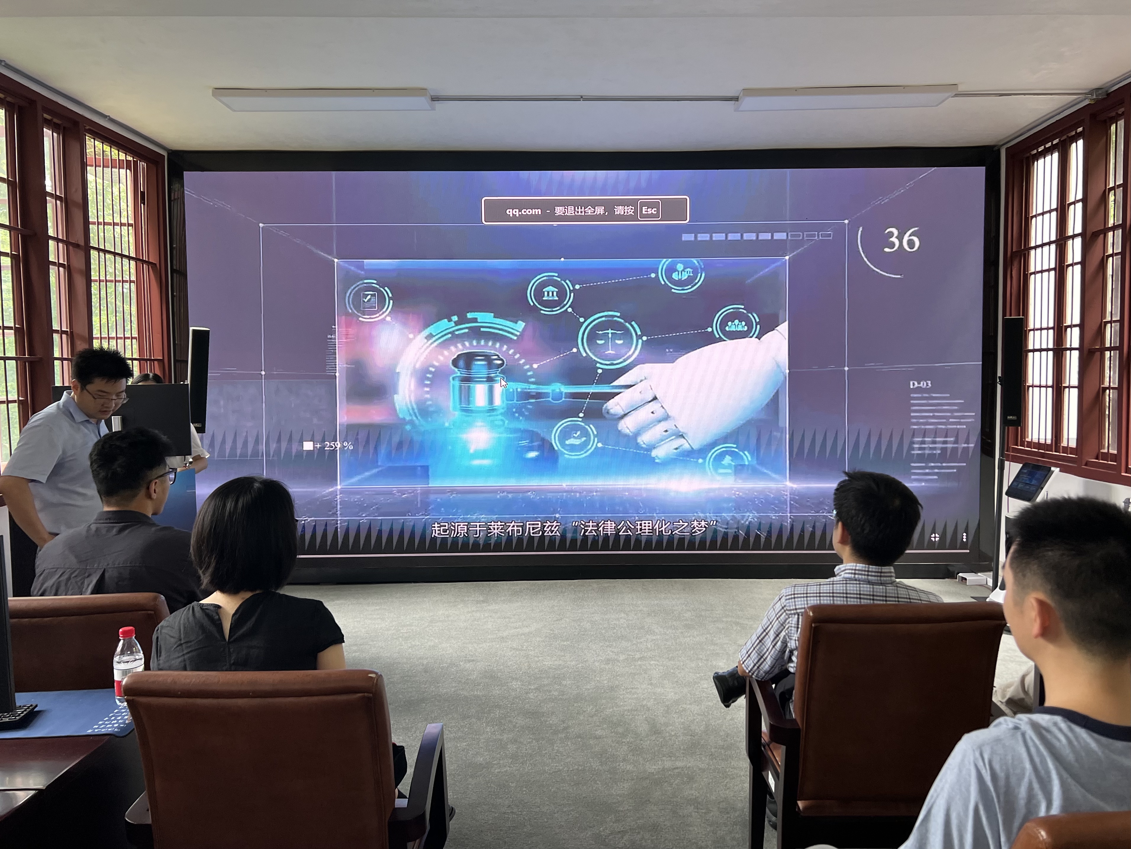 调研团队首先参观了浙江大学数字法治实验室,并共同观看了实验室成果介绍视频。浙江大学数字法治实验室聚焦立法和司法、执法领域的数字化研究,通过打造数字化实验环境,将人工智能、计算机科学与技术、大数据分析、云计算、区块链等技术赋能立法、司法和执法,在推动中国数字法治建设和法学教育工作创新、为国家培育高水平法治人才方面积累了丰富的工作经验。参观过程中,吴亦全老师就“智海—录问”法律大模型的整体架构、数据资源、知识增强、模型评测等内容进行了详细介绍。