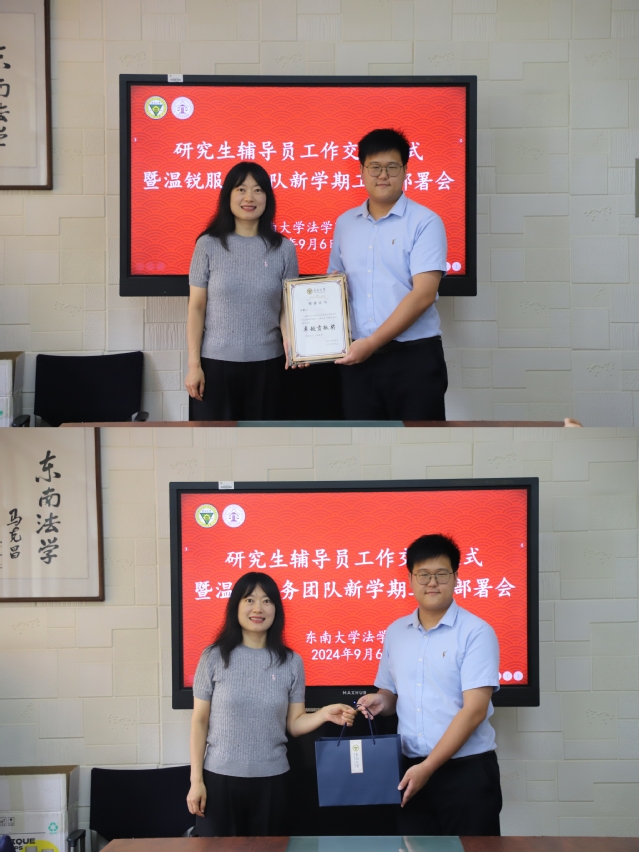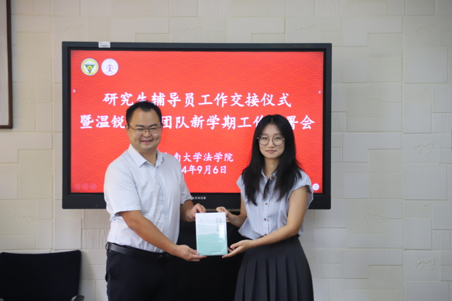 交接仪式上,刘启川书记充分肯定了上个月从研究生辅导员岗位上卸任的闻昊老师对学院做出的卓越贡献。闻昊老师任职两年多以来,工作认真投入,不断提升自我,充满干劲和韧性,获得了全院上下的一致认可。刘书记结合其本人的经历以及闻昊老师的成长历程,勉励新任研究生辅导员仲艺老师和其他温锐服务团队成员练就过硬本领,在工作实践中不断开拓进取,长见识、增才干,为学院发展谱写新篇章。