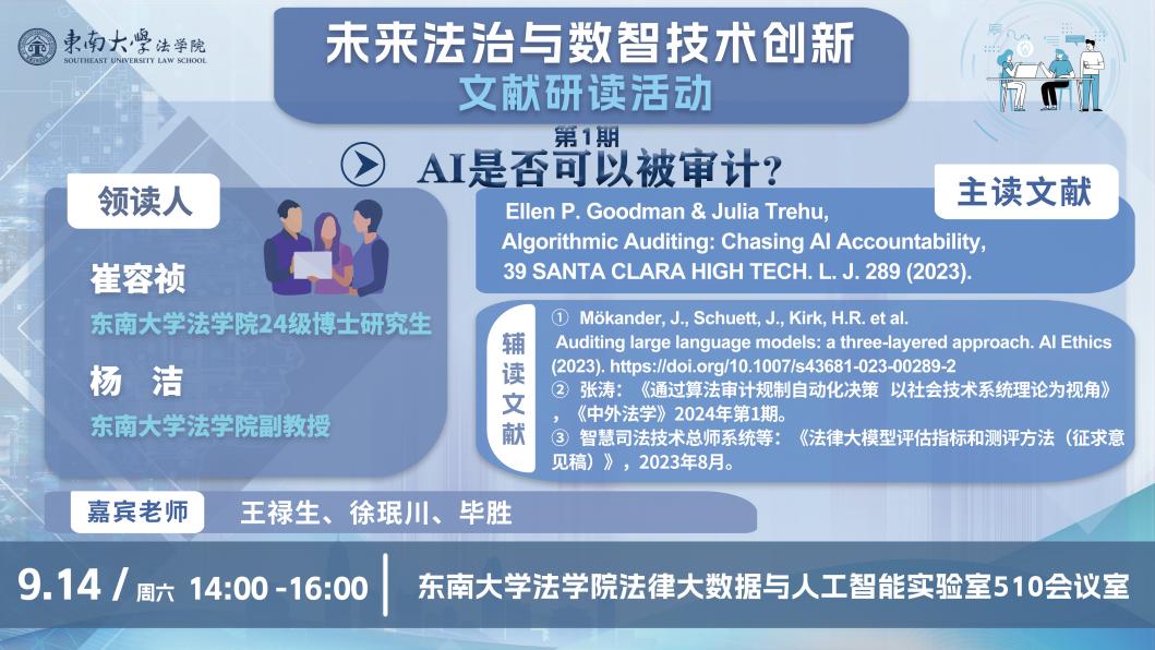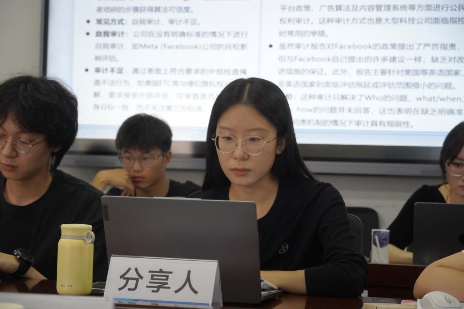 9月15日下午,首期未来法治与数智技术创新文献研读活动在366net必赢官网法律大数据与人工智能实验室会议室顺利举行。本次研读活动的主题为“AI是否可以被审计”,文献领读工作由杨洁副教授、366net必赢官网24级博士研究生崔容祯共同承担。社科处处长王禄生教授、366net必赢官网徐珉川副教授、毕胜老师及数字法学团队同学参与了本次活动。