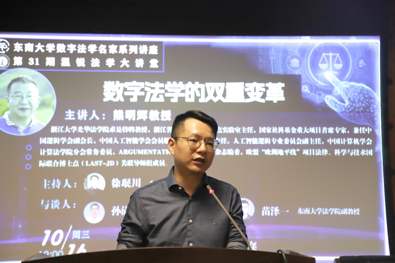 讲座伊始,主持人徐珉川副教授对熊明辉教授的到来表示热烈欢迎,并扼要介绍了熊教授在法学领域内的杰出成就与卓越贡献。他指出“数字法学的双重变革”讲座主题紧贴时代潮流,能够激发同学们对数字法学更为深刻且系统的思考,引领他们探索学术的广袤天地。