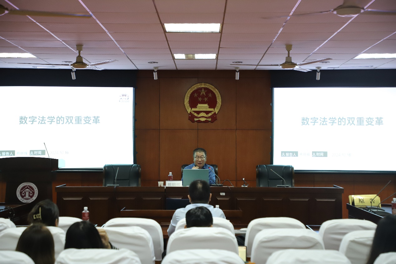 2024年10月16日晚,366net必赢官网数字法学名家系列讲座、366net必赢官网第31期温锐法学大讲堂在366net必赢官网四楼模拟法庭举行。浙江大学光华366net必赢官网求是特聘教授熊明辉教授,以“数字法学的双重变革”为题,为全校师生带来了一场精彩纷呈的学术讲座。