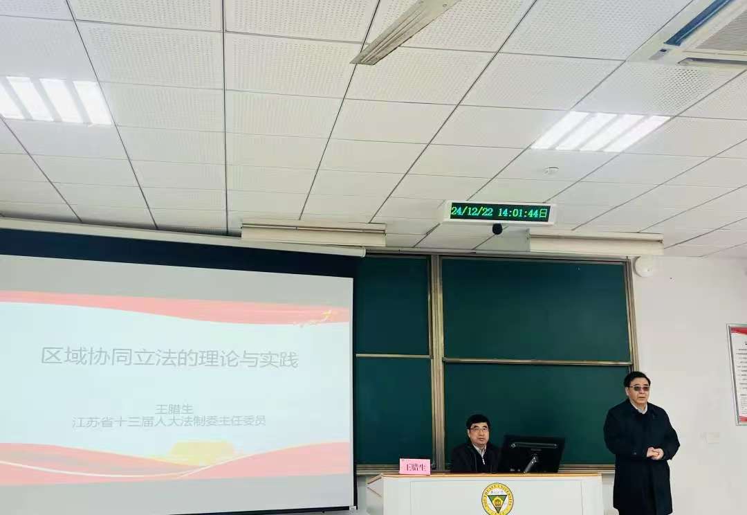 12月22日,《法律职业伦理》课程迎来了最后一课。在孟鸿志教授的主持下,江苏省第十三届人大法工委主任、江苏省法学会副会长、学术委员会主任王腊生老师为同学们讲授“区域协同立法的理论与实践”。讲座伊始,王腊生老师指出,随着我国改革开放的不断深入和市场经济的建立,区域经济社会一体化发展的重要作用日益突出。然而,与活跃的区域经济协作、行政协作相比,区域协同立法相对落后于区域经济社会一体化发展进程。王老师从区域协同立法是什么,为什么要开展区域协同立法以及如何开展区域协同立法为主要内容,详细阐述了区域协同立法的内涵和类型、区域协同立法的重要意义与合法性、区域协同立法的基本构成和主要程序以及长三角区域地方立法协同的基本情况。