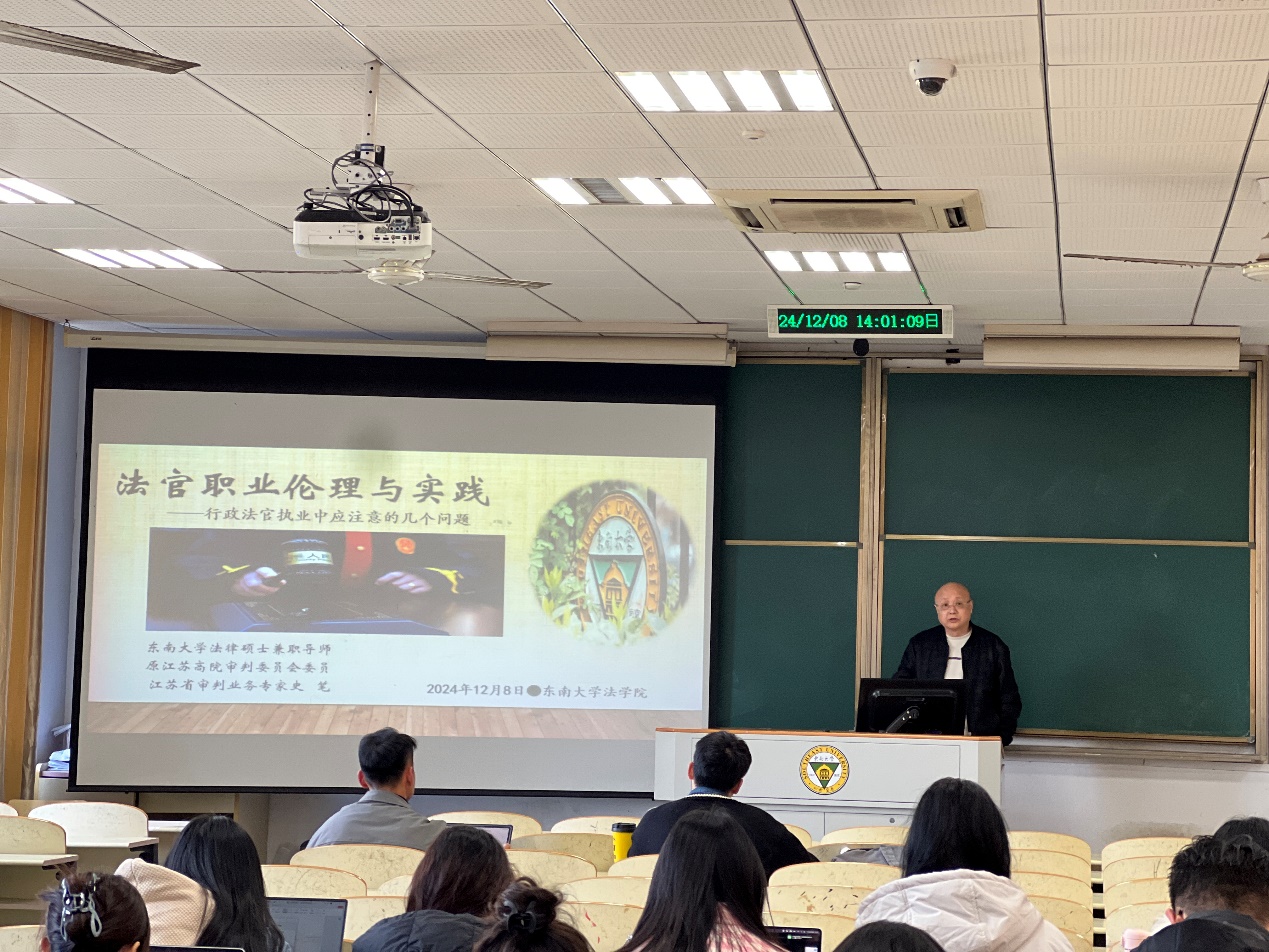 12月8日,江苏省高级人民法院史笔法官为同学们讲授了法官的职业伦理与实践。首先,史笔法官介绍了集中体现在《法官法》《法官行为规范》《法官职业道德基本准则》中的法官职业伦理基本要求,并对其中的重要条款进行了详细讲解。随后,史笔法官通过引入违反法官职业伦理的典型案例,向同学们强调未来务必坚持法律从业者的职业道德。最后,他重点阐释了行政法官执业中应当注意的四个问题:第一,加强行政规章、规范性文件的学习和积累。第二,加强民商事法律规范的学习和研究,此处史法官还向同学们提出了“公法上的请求权基础与民法有何不同”的引申思考题。第三,加强行政案件裁判方法的学习和探索,指出行政案件法律检索应当做到“五个不仅要,也要”。第四,加强合议庭成员之间的沟通和配合。