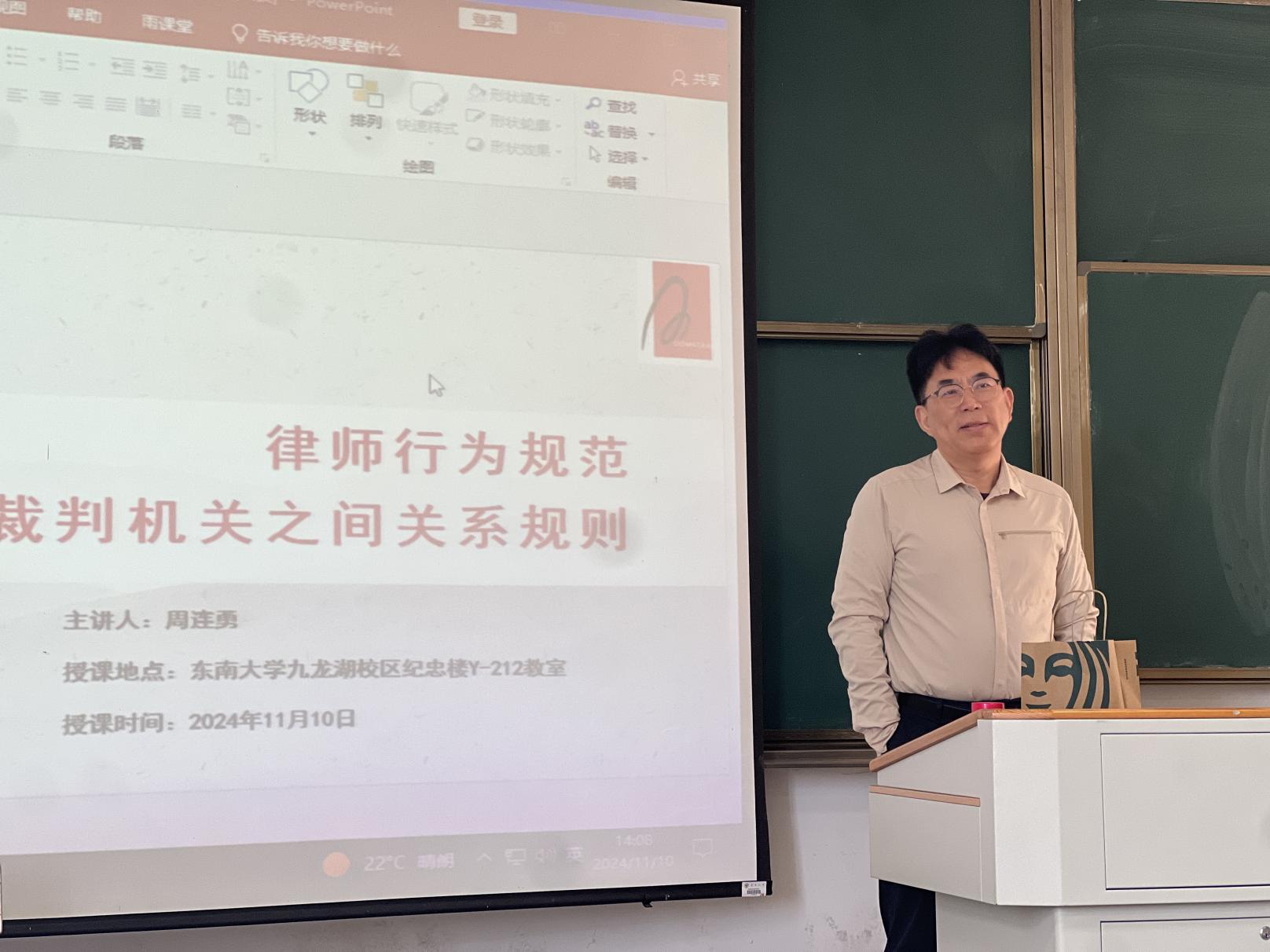 11月10日,江苏博事达律师事务所执行主任、合伙人、高级律师周连勇律师为同学们讲授了律师与裁判机关之间关系规则。周律师的授课内容主要围绕律师专门职责、律师职业义务、律师与各方主体的关系、律师的公共责任、作为管理者的律师伦理五个部分展开。谈及律师与同行律师的关系时,周律师提出了“三相互”的原则:相互欣赏、相互提醒、相互成就。接着在介绍律师事务所运营规则时,他分享了联系自身经历所总结的“六有六路”经验:工作有声有色;生活有滋有味;做人有情有义;年轻律师问路赶路;骨干律师带路铺路;资深律师让路指路。此外,周连勇律师还为同学们提出了有关在校学习生活的宝贵建议,如坚持锻炼身体、请教前人经验以及关注前沿动态等。