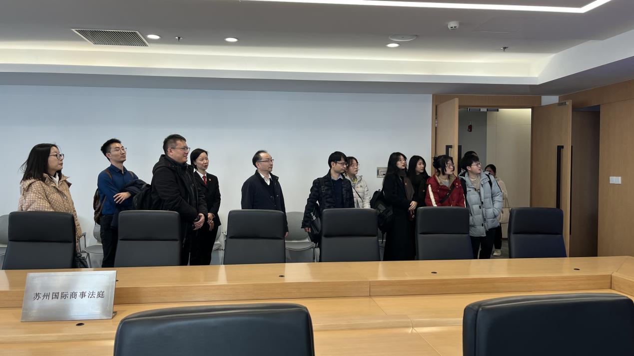 我院师生党员首先参观了苏州国际商事法庭,深入了解法庭的诉讼服务中心和数字化建设成果。苏州市中级人民法院副院长杨恩乾、苏州国际商事法庭庭长蔡燕芳带领与会人员实地考察,并简要介绍了法庭在推动国际商事案件审判数字化方面的实践经验。随后,双方在党建学习与业务交流的座谈会上进行了深入探讨。